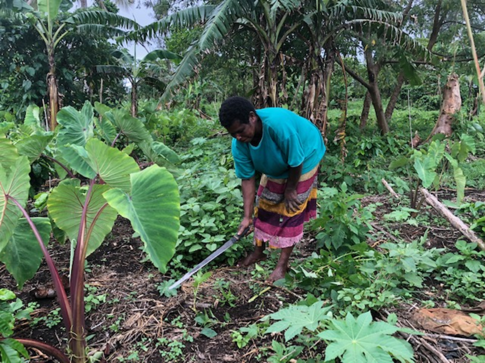 Monica tending to her plot, which, in addition to coffee arabica, includes taro, banana, cassava, kava, and sandalwood